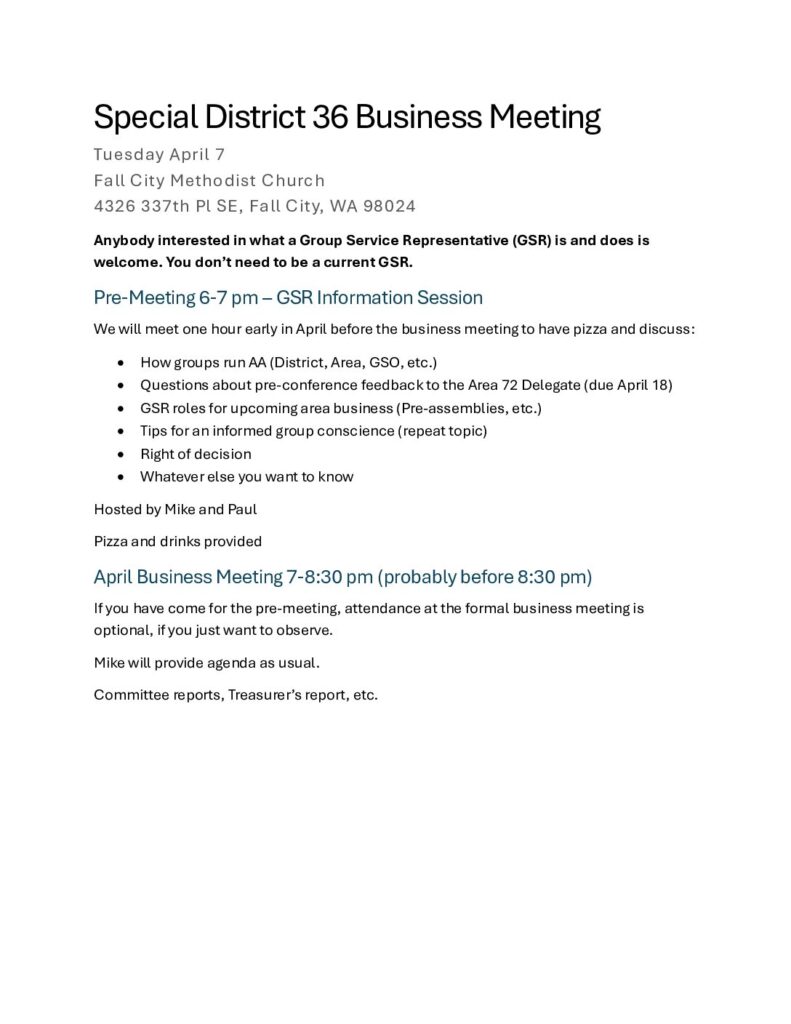 GSR Information Session – Before the Regular District 36 Business Meeting – This Tuesday, April 7, 2026 GSR Information Session – Before the Regular District 36 Business Meeting – This Tuesday, April 7, 2026 By Registrar on April 4, 2026